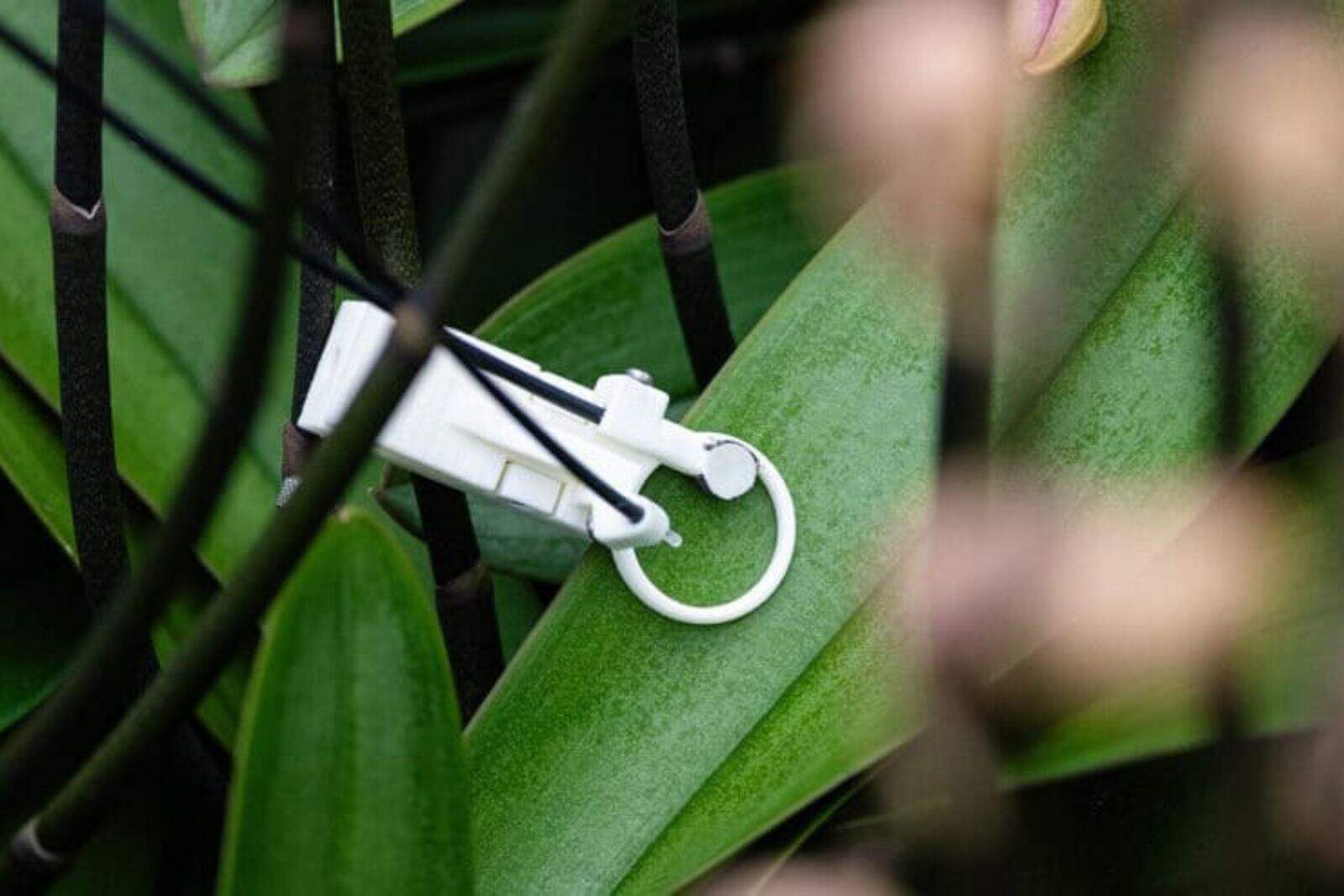 Phalaenopsis heeft mooi stug blad waarop de fluorescentiemeters goed zijn te bevestigen. Tielemans: “Je zet ze met behulp van een knijper op het jongst volgroeide blad en kiest daarbij het blad van een plant dat zo horizontaal mogelijk staat. De meter geeft vervolgens iedere vijf minuten een lichtimpuls en meet hoeveel licht daarvan weerkaatst wordt. Het licht dat niet weerkaatst wordt, gebruikt de plant voor fotosynthese.”